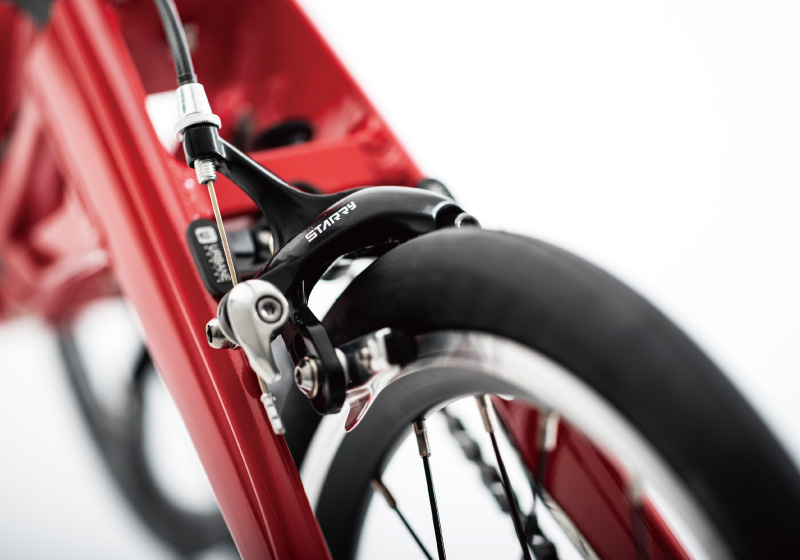 ディスクブレーキよりも軽量で輪行時にトラブルを発生しにくいキャリパーブレーキを採用。