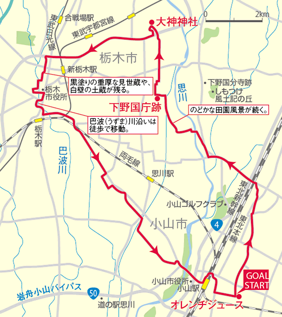 小山市郊外の田園風景を眺めながら、蔵の町栃木市内を堪能するコース。勾配もほとんどなく、女性や日帰りポタリングに最適です。帰路