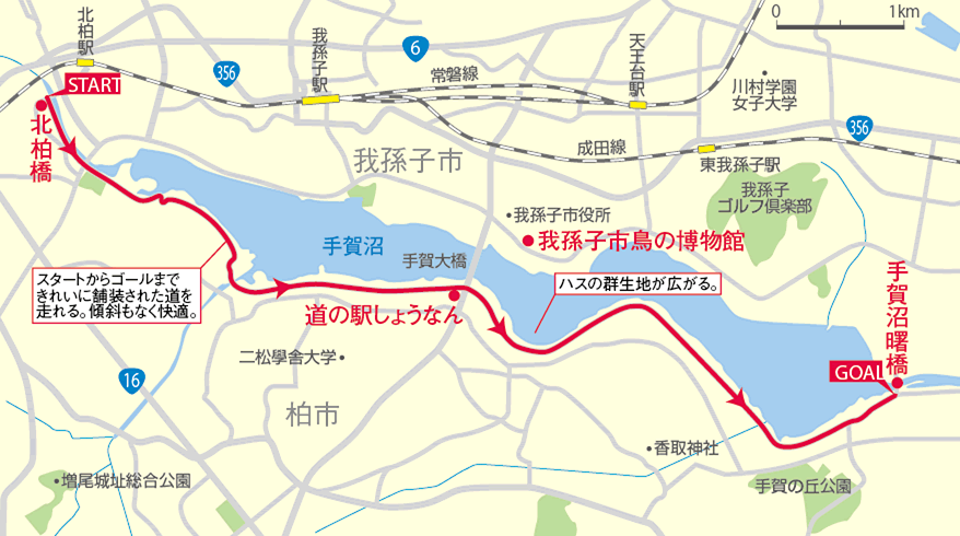 全長9.4km の「手賀沼自然ふれあい緑道」は、のんびり景色を見ながら走っても1時間半程度で往復できますが、水の博物館、鳥の博物館、道の駅、ボート乗り場、釣堀などもあるので、数時間~1日中、一人でもご家族でも楽しめます。駐車場やトイレも多く、駅からのアクセスもよし。初輪行やサイクリングロードデビューに最適です。