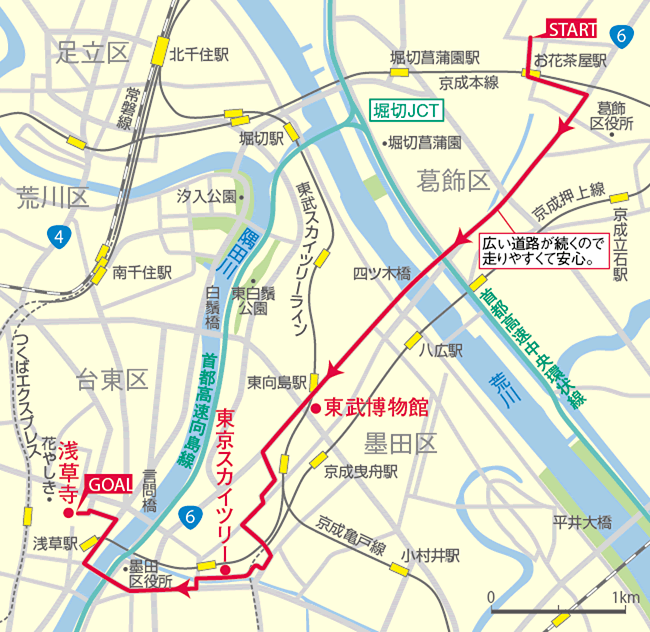 お花茶屋店から約6 キロの距離にあるスカイツリーまでのサイクリングがオススメです。走るにつれてだんだん大きく見えるスカイツリーに、サイクリングの楽しさが倍増していきます。途中には鉄道博物館もあり、道路も広いので走りやすくて安全です。チョット走れば浅草寺もあり、お参りをして帰るのもいいと思います。