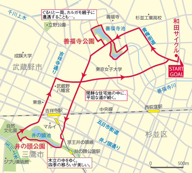 杉並区界隈には、公園が意外に多く、たった1 日の休みでも公園めぐりが楽しめます。妙正寺川には川面に迫り出す枝垂桜の花吹雪。ゴールデンウイークにはたくさんの鯉のぼり。少し行けば井の頭公園があり、善福寺公園ではカルガモ親子に遭遇することも…。もちろん、サリー( 愛犬) も一緒です。和田サイクルのブログで紹介しています。