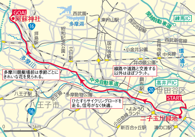 東京や神奈川にお住まいのサイクリストならみなさんご存じの、多摩川沿いのサイクリングロードがオススメです。羽田空港近くから羽村市まで全長50km のサイクリングコース。LORO から神奈川方面に向かい、二子玉川緑地から多摩川河川敷に入れます。上流の阿蘇神社では、自転車安全祈願のお守りもいただけます。
