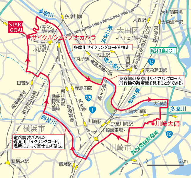 お店から多摩川サイクリングロードに出て川崎側を走行し、多摩川大橋を東京側に渡って、羽田方面に向かいます。富士山、飛行機の離着陸の景色を楽しめます。産業道路から川崎側に渡ると、川崎大師です。おそば、アナゴ丼、くずもち、戻る途中では追分まんじゅうがおすすめです。鶴見川サイクリングロードでお店に戻ります。