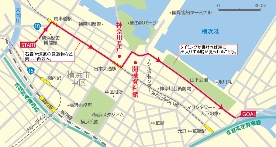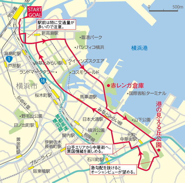 近代的なみなとみらいエリアから、赤レンガ倉庫など歴史を感じる街並みまで走り抜けます。コース中には横浜ならではのさまざまな「発