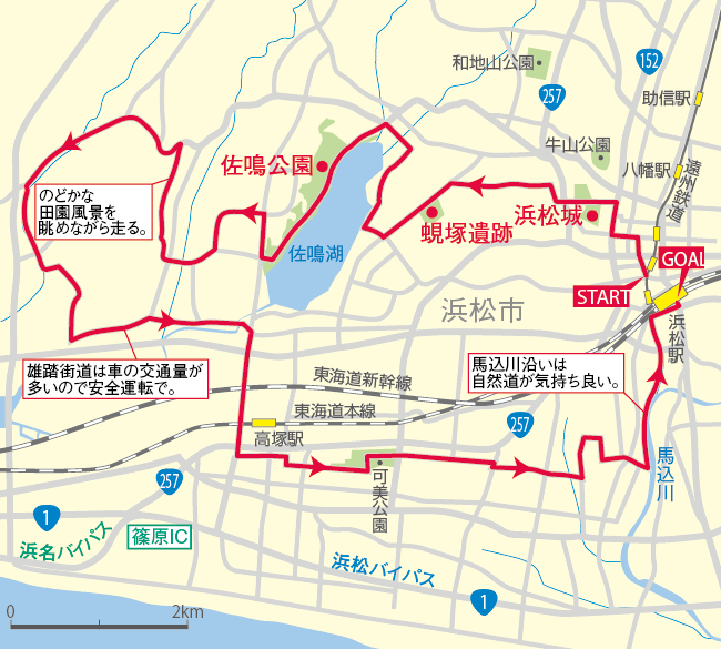 浜松駅からスタートして、名所を巡りながらまた駅に戻ってくるコースです。距離は約30km なので、初心者の入門ルートとしてオススメです。途中の浜松城や蜆塚遺跡で街の歴史に触れられ、また緑豊かな佐鳴湖では野鳥観察舎などがありバードウォッチングもできます。自然と共生する都市、浜松の魅力をのんびりゆったり楽しんでください。