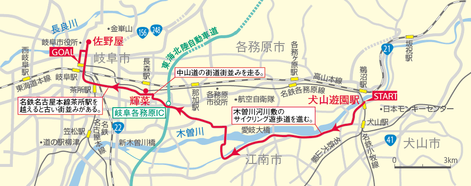 中山道で旧街道の町並みを楽しみ、金華山の麓の佐野屋でねぎ焼きを食べ、柳ヶ瀬商店街を散策。ツバメ屋のどら焼きも有名です。岐阜駅からは輪行で。birdyの機動力を活かしたコースです。