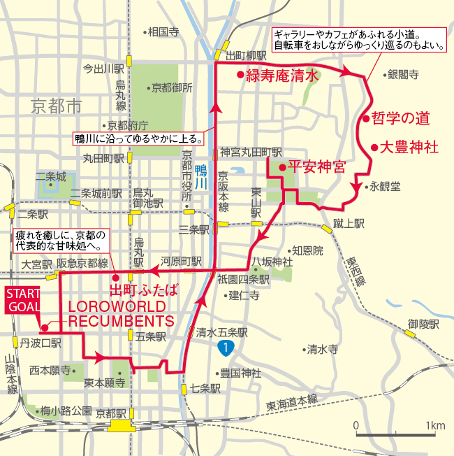 鴨川・哲学の道・大豊神社・ねじりまんば・平安神宮等の名所、京都を代表するスイーツ店を巡る、歴史と甘味を贅沢に楽しめるサイクリングルートです。店舗への帰路はbirdy の機動性を活かせる輪行も体験して頂けます。折りたたみ自転車の魅力・京都の醍醐味を凝縮したサイクリング&輪行ルートとなっております。
