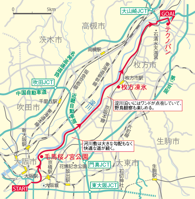 水都大阪の川沿いを走りながら自然を感じられる片道約35km のコースです。春には桜が満開になる桜ノ宮公園内を経由し、淀川へ。淀川のワンドでは野鳥の観察もできます。目的地は淀川を走るサイクリストに人気の「テクノパン」さん。イートインスペースで休憩もできます。
