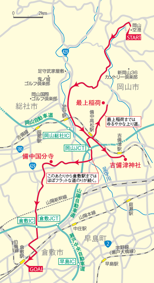 岡山空港から吉備路サイクリングコース経由で倉敷駅まで走る約40km のコースです。空港は山