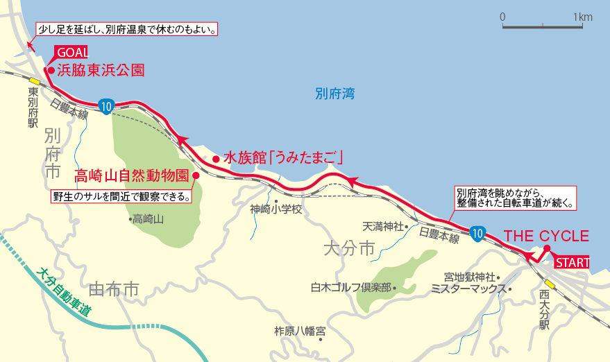 海岸沿いの道路は自転車道も整備されており、別府湾を眺めつつ気持ちよく走れます。往復15km 程度ですので、お時間のある方は観光も合わせてお楽しみください。途中にある水族館「うみたまご」や野生のサルを間近で観察できる高崎山自然動物園。別府市内の散策や別府温泉を満喫されるのもオススメです。
